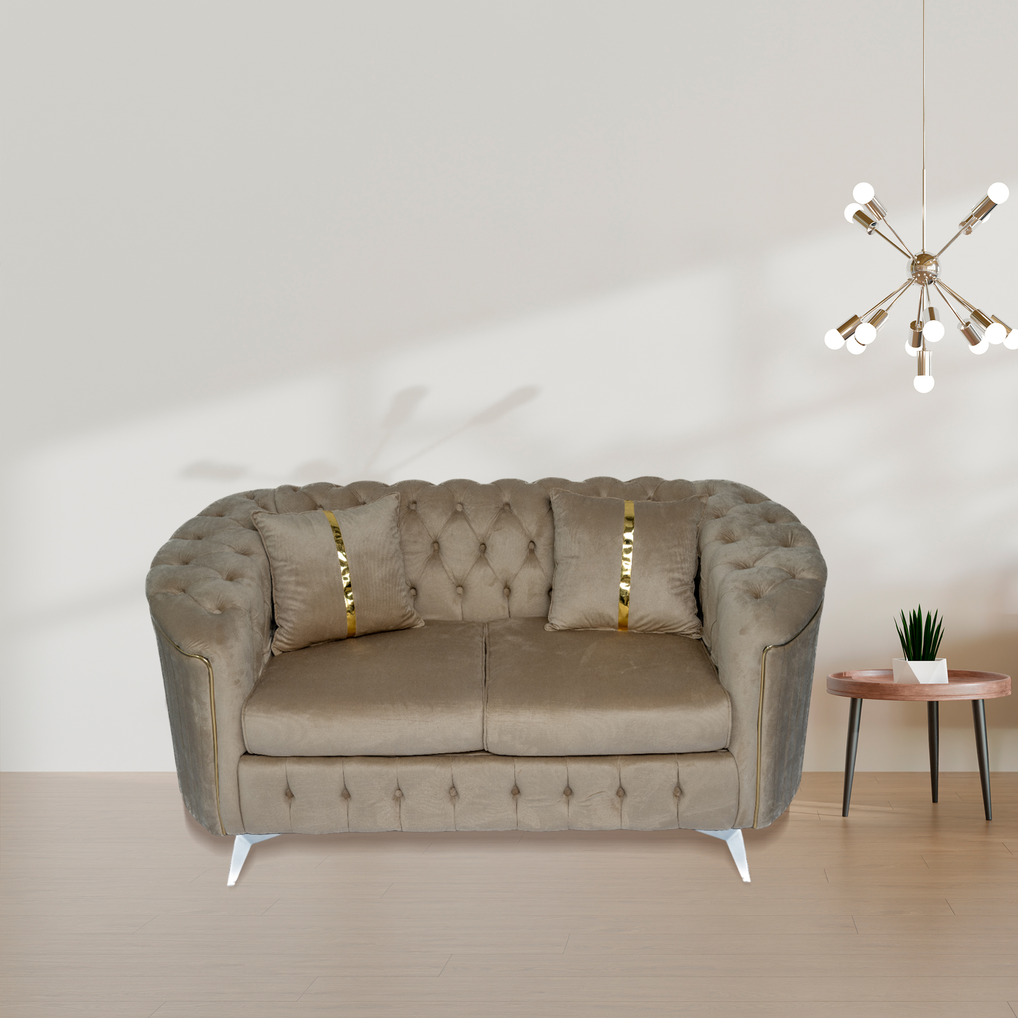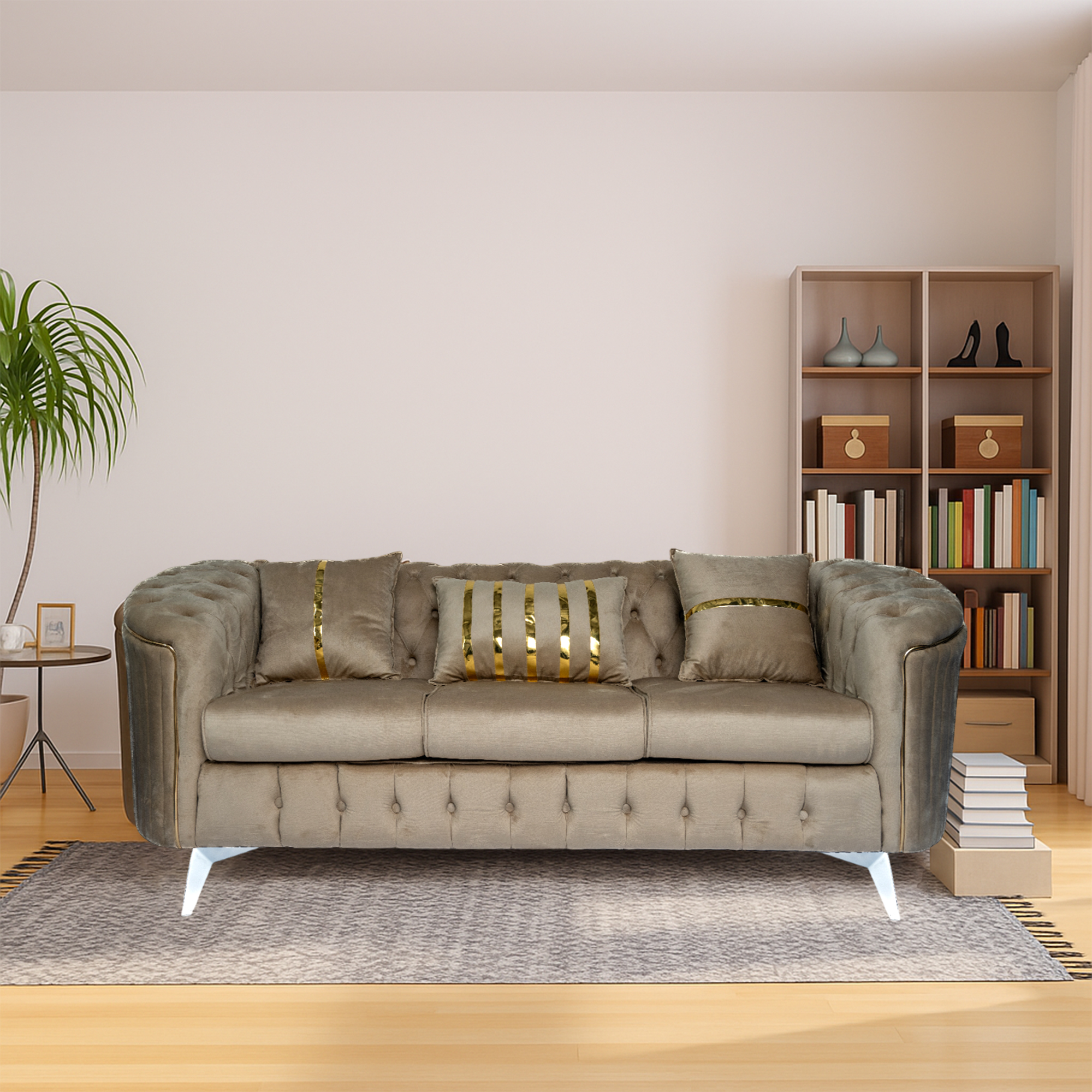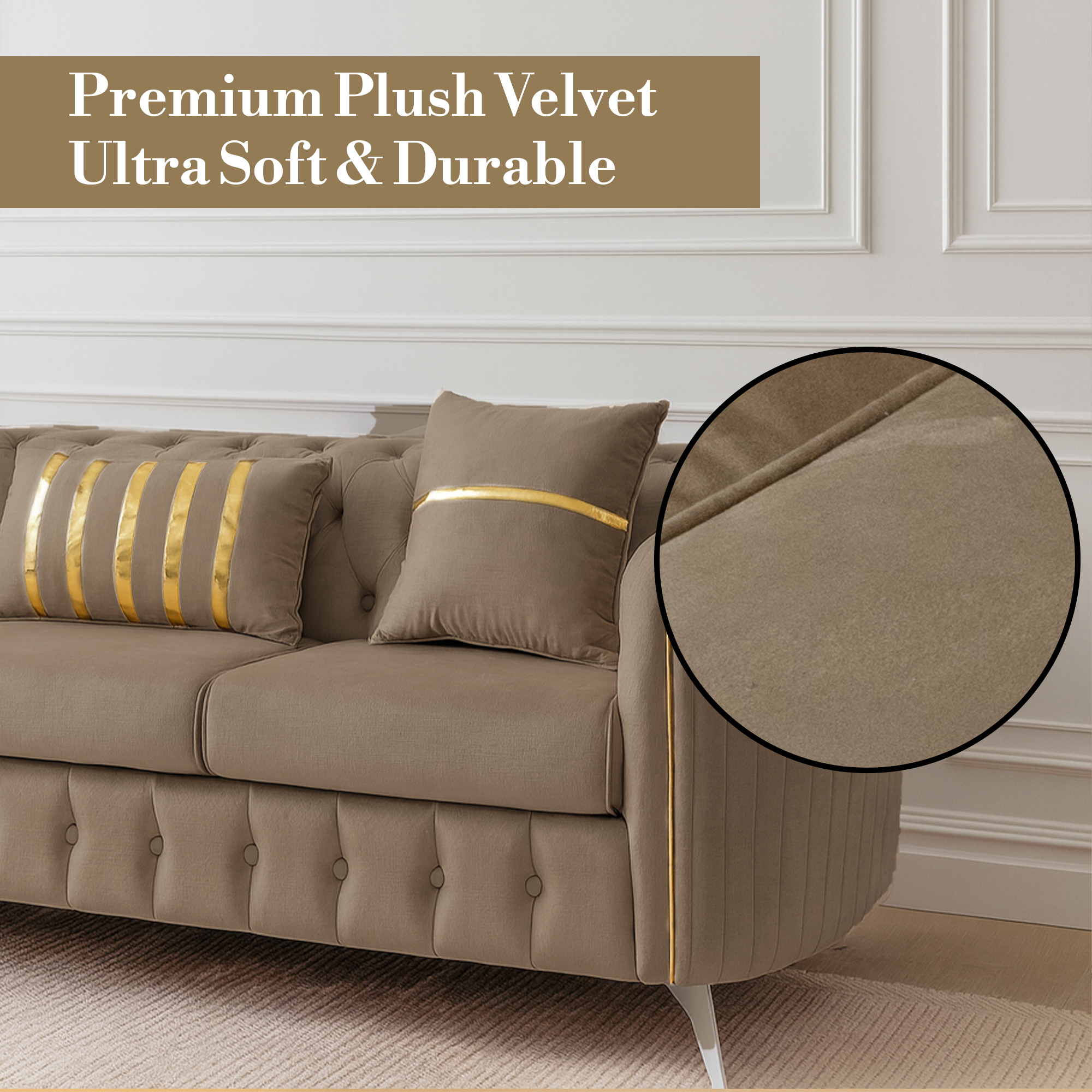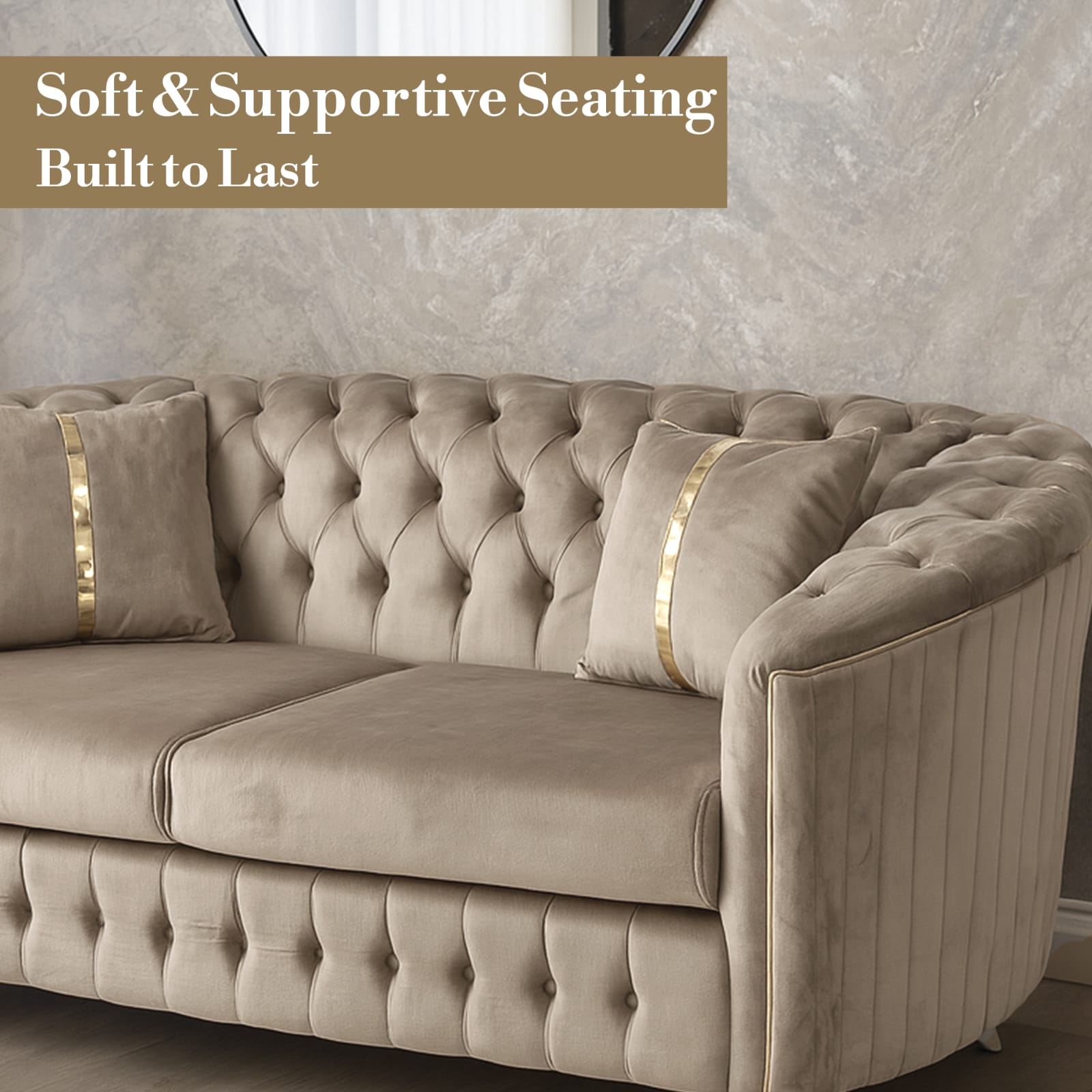The signature deep button tufting covers the backrest and base, providing a rich, textured look. It features a unique curved armrest design that flows seamlessly into the back, offering a more relaxed and ergonomic seating experience. Each piece is detailed with vertical silver or gold piping and matching metallic legs, adding a touch of “jewelry” to your furniture. Whether you are hosting guests or curling up for a movie, the supportive high-resilience foam cushions ensure comfort that lasts for years.