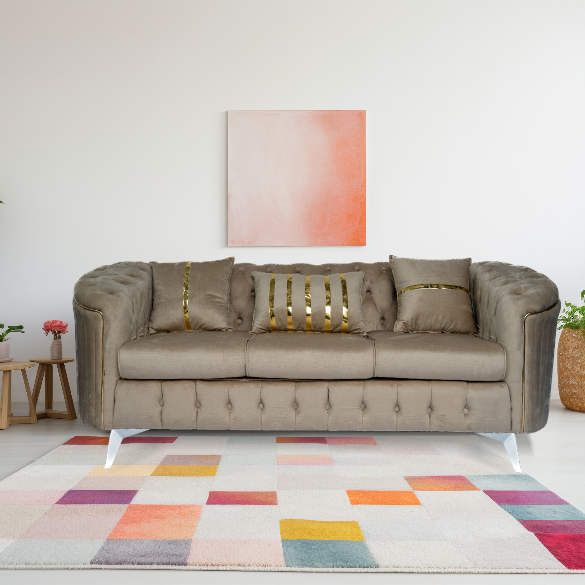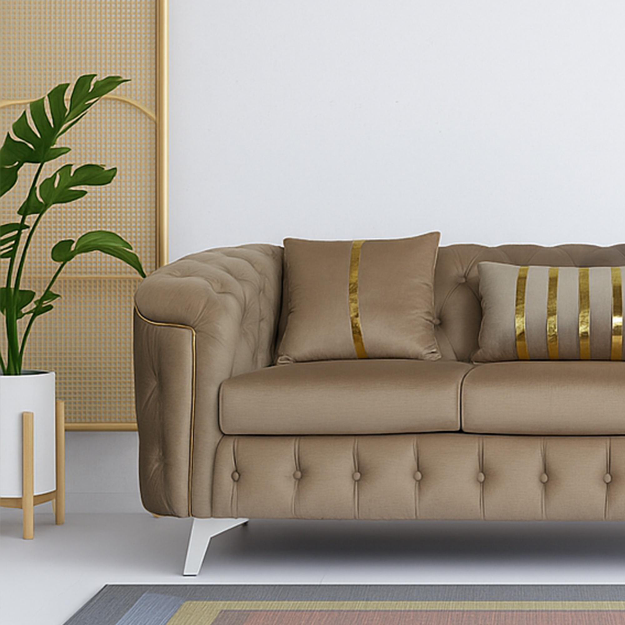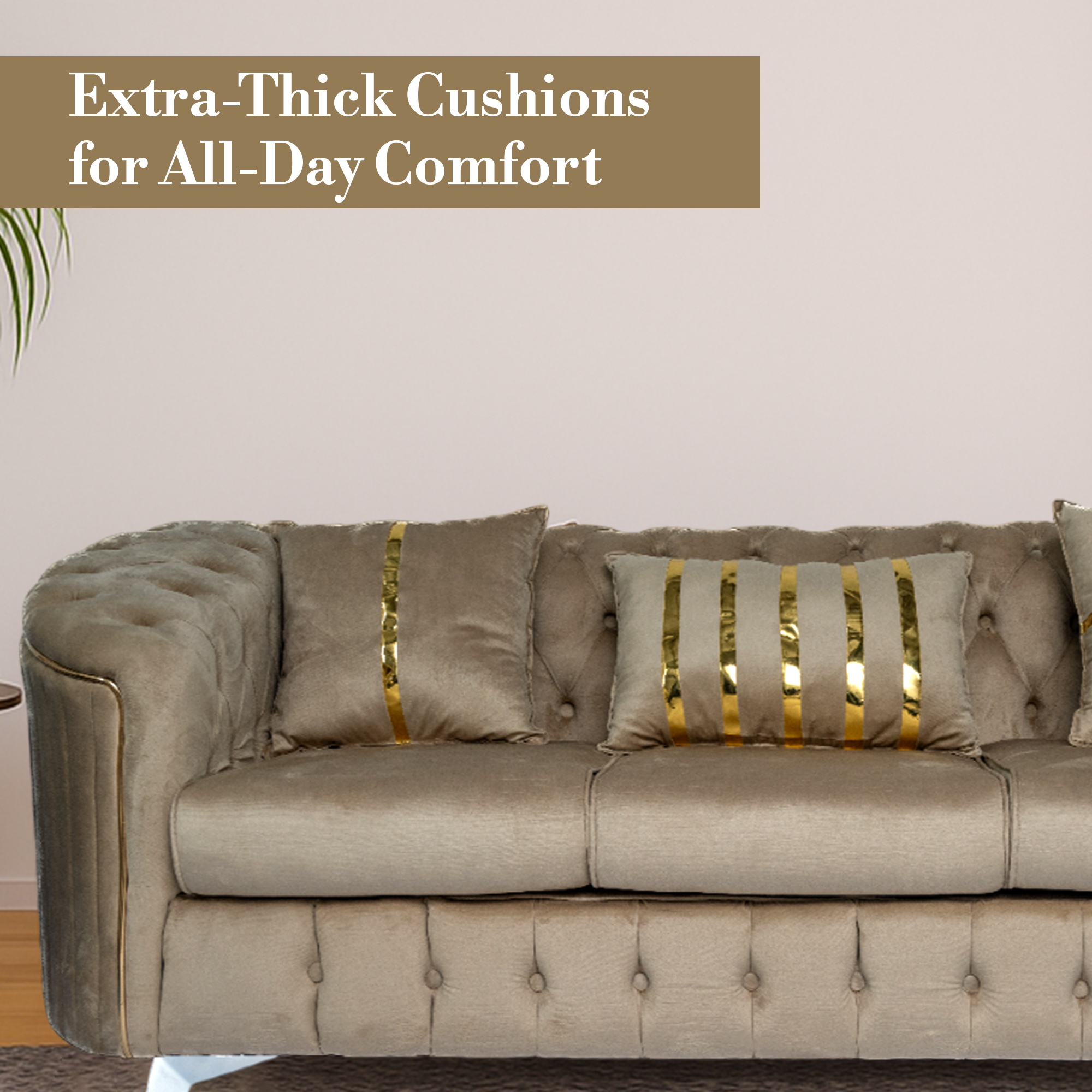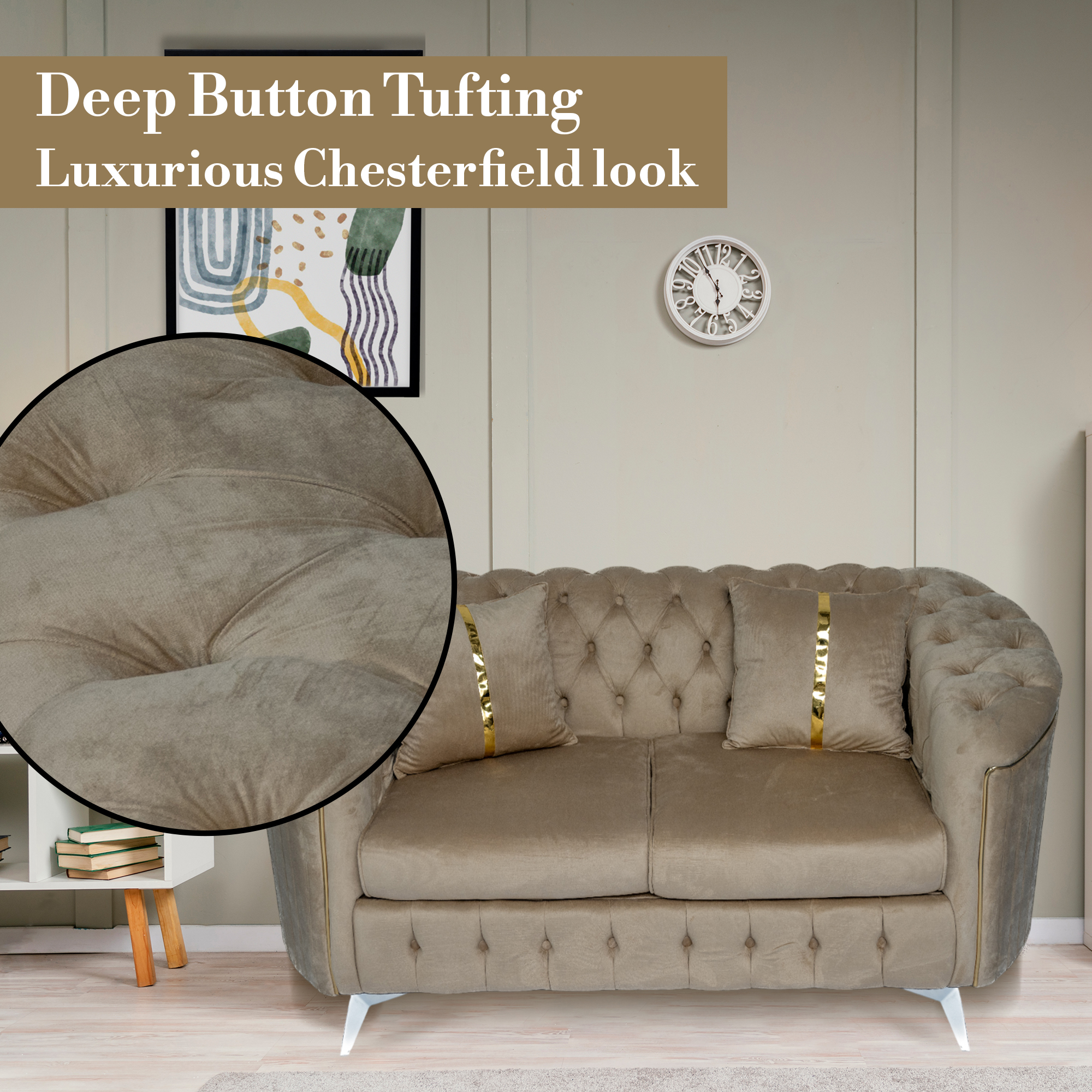 The signature deep button tufting covers the backrest and base, providing a rich, textured look. It features a unique curved armrest design that flows seamlessly into the back, offering a more relaxed and ergonomic seating experience. Each piece is detailed with vertical silver or gold piping and matching metallic legs, adding a touch of “jewelry” to your furniture. Whether you are hosting guests or curling up for a movie, the supportive high-resilience foam cushions ensure comfort that lasts for years.